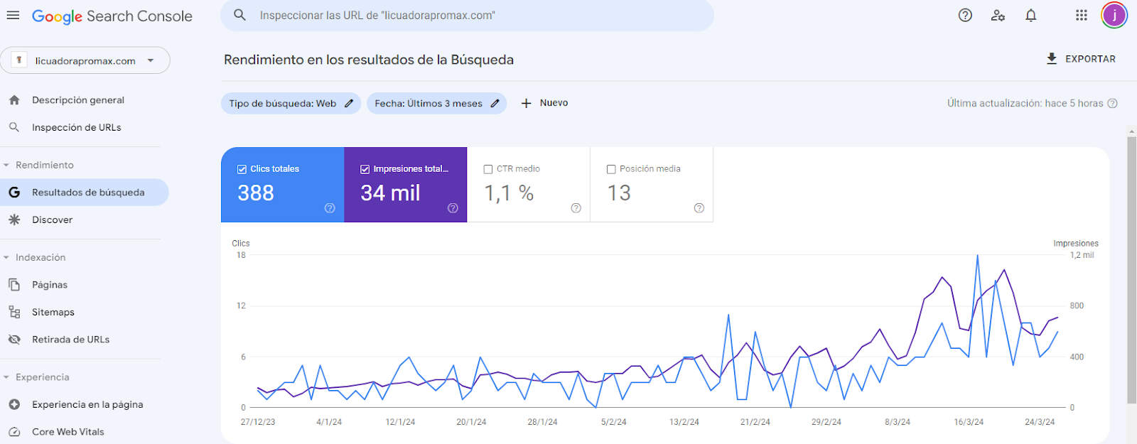 388 clics, unas 34 mil impresiones en total 1,1% CTR medio y una media de posición 13.